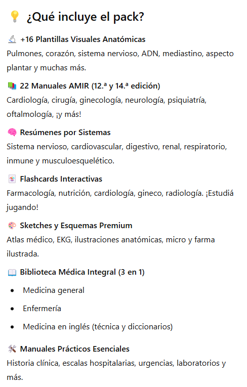 - 📘 Gran pack de Esquemas Médicos: +1100 esquemas ilustrados full color para entender fácilmente anatomía, sistemas y funciones vitales.