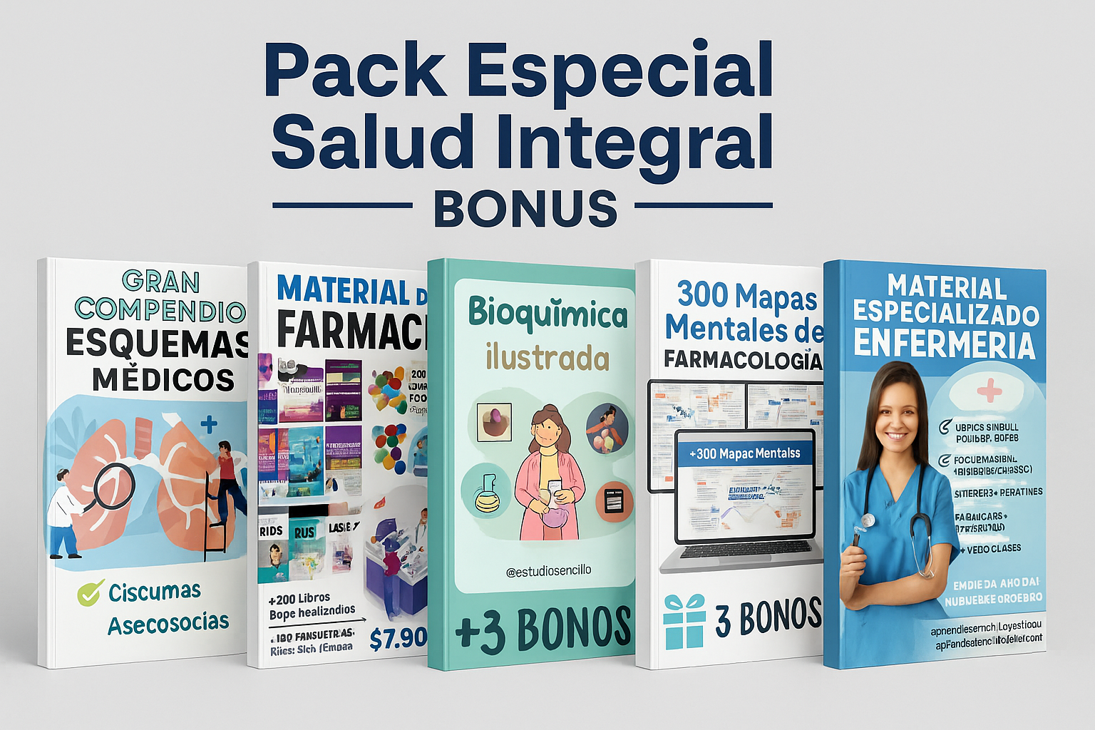 Al adquirir nuestro recurso principal, desbloqueás acceso exclusivo a este BONUS 5 en 1, ideal para estudiantes y profesionales de Medicina, Enfermería y Farmacia.