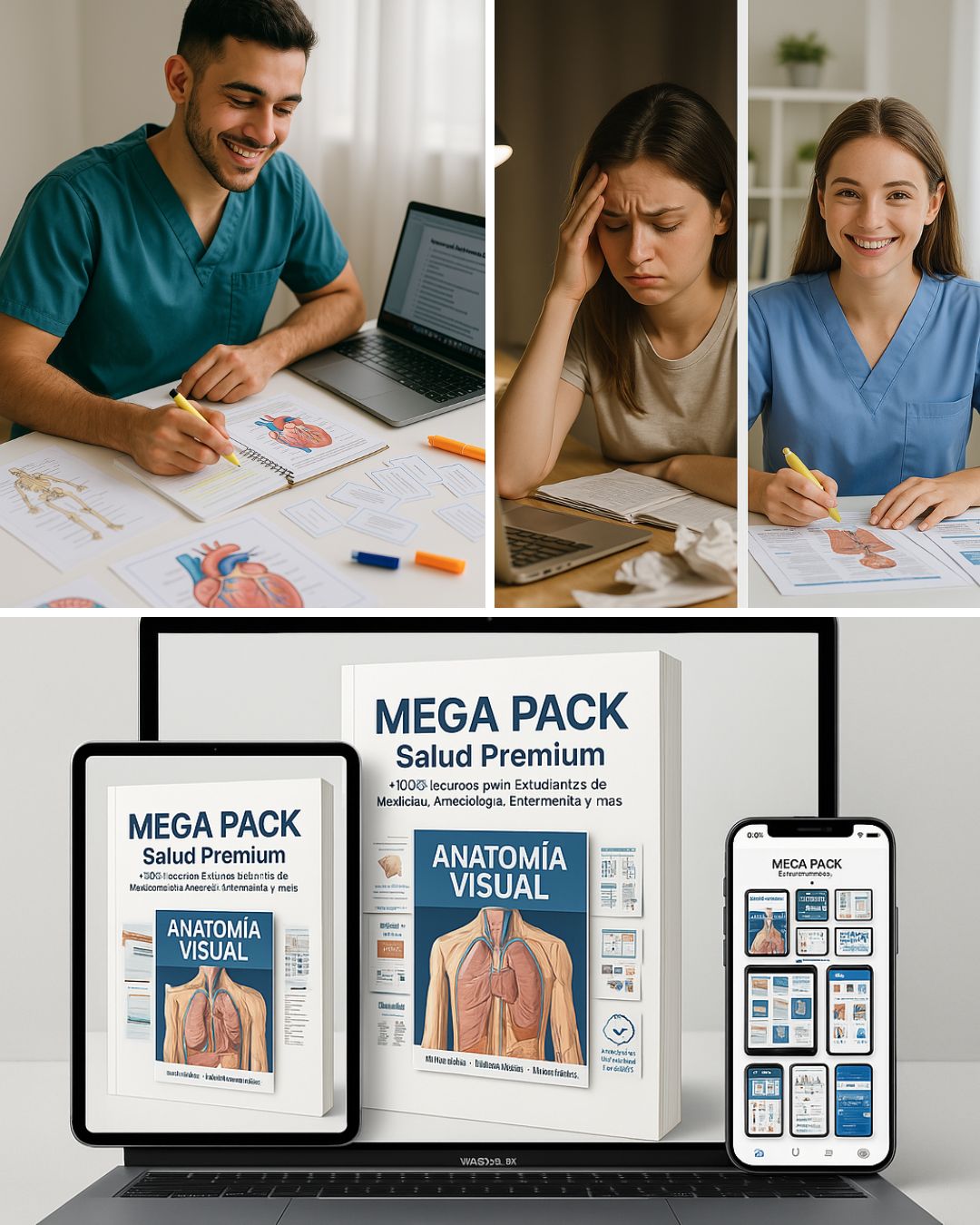 Incluye más de 1.000 recursos entre esquemas, flashcards, plantillas anatómicas, resúmenes, manuales clínicos y material visual para estudiar con más claridad y rapidez. + TODOS LOS BONUS